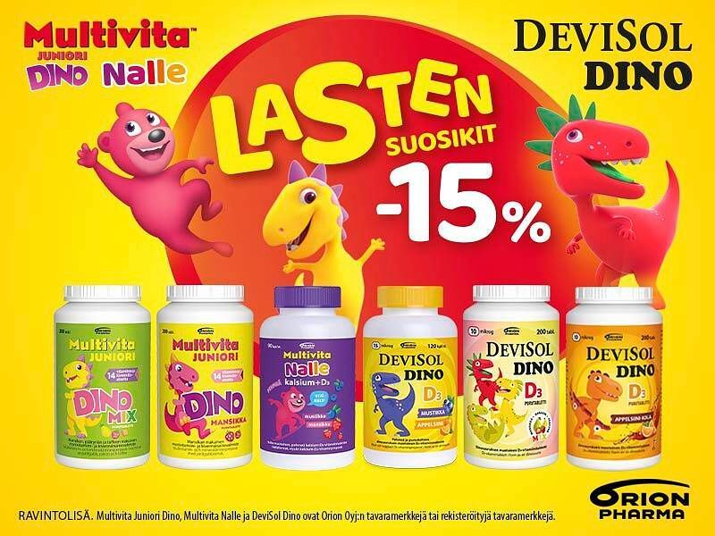 Hurjan hyvät, eri makuiset ja väriset nallen ja dinon muotoiset valmisteet auttavat täydentämään lasten ravitsemusta ja tekevät vitamiinien ottamisesta hauskaa.